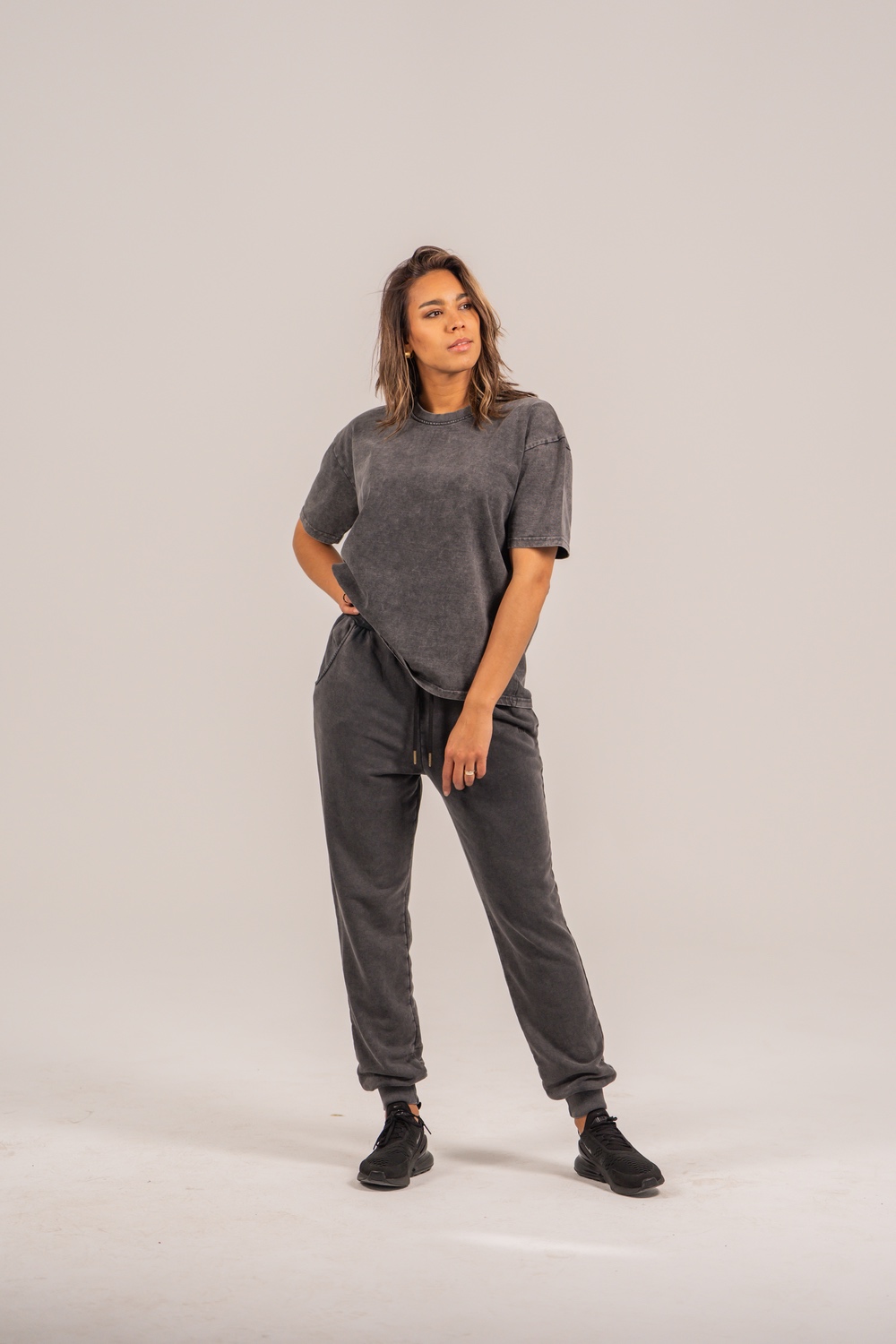 Joggery Grey Women to wygodne, nowoczesne szare spodnie dresowe damskie, które łączą minimalistyczny design z komfortem noszenia na co dzień. Podczas produkcji materiał przeszedł specjalny proces spierania, dzięki czemu uzyskaliśmy charakterystyczny efekt przecieranego szarego koloru, nadający spodniom wyjątkowy, lekko vintage’owy charakter.