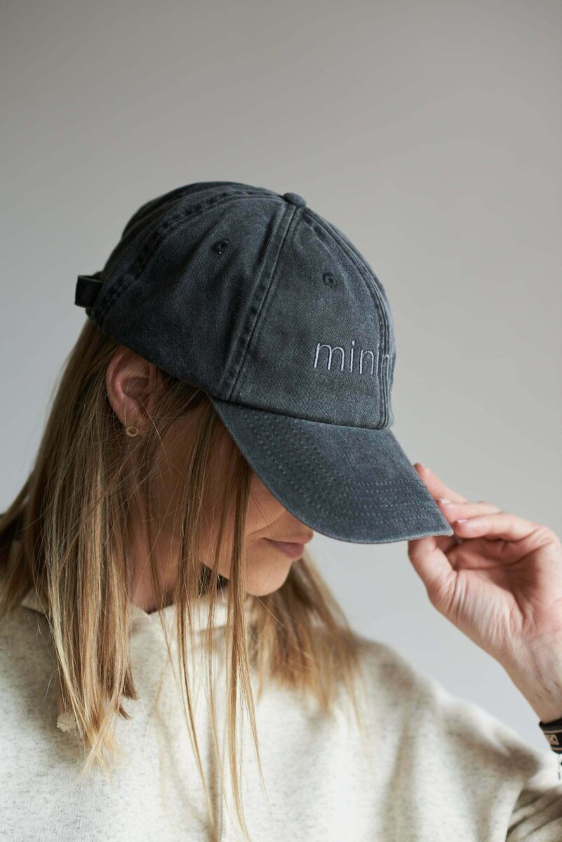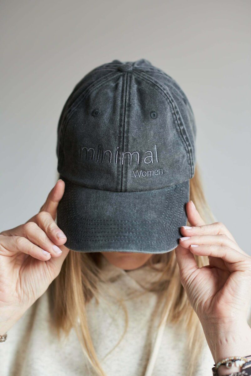 Czapka z daszkiem w kolorze vintage black to modny dodatek inspirowany stylem retro. Model wyróżnia się haftem logo Minimal Women oraz efektem sprania, który nadaje czapce charakterystyczny, vintage wygląd.